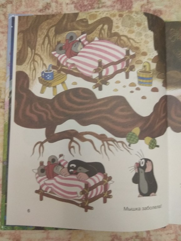 История закончилась тем ,что Кротик нарвал для ее лечения ромашек, заварил целебный отвар .Мышка выздоровела и снова стала играть вместе с Кротиком !