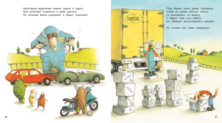 "Марк - весёлый маленький пёсик. Сегодня сбылась его мечта: он едет в автомастерскую. Там он будет во всём помогать своему папе - автомеханику. Их ждёт очень много работы и самые разные машины: пассажирские автобусы, легковые автомобили и даже большие грузовики. Одни надо починить, другие - помыть, а третьи - покрасить.