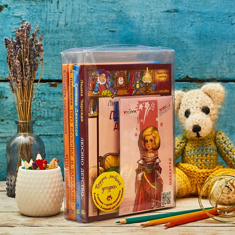 - Люсино детство (автор Чарская Л., художник Володькина Е.), а также кукла-наряжайка «Маскарад» (кукла из плотного картона плюс шесть нарядов и шесть раскрасок - заготовок для нарядов).