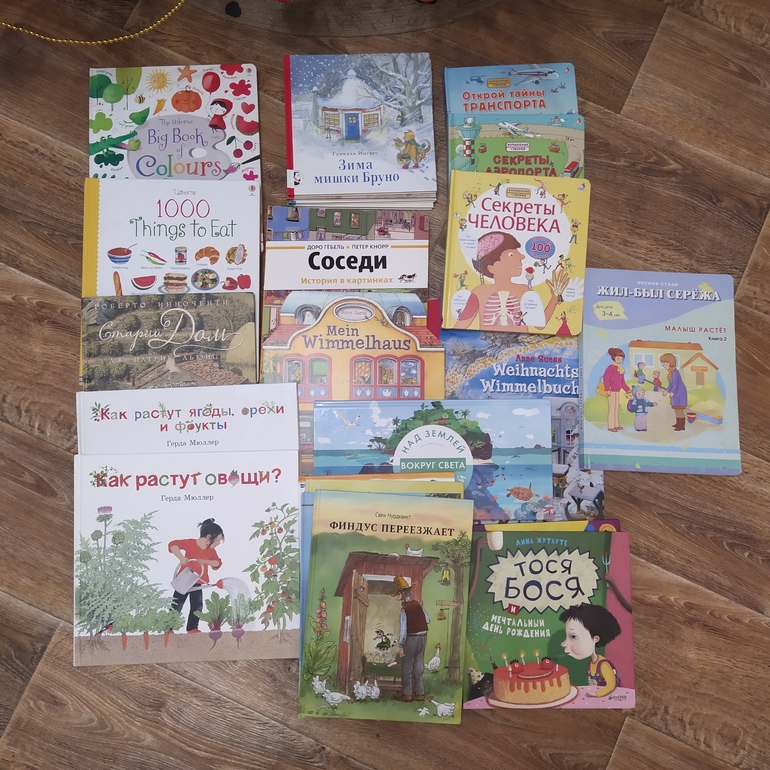 1. Навершием топа поставлю книги, которые любимы уже не первый год. Посмотрела прошлые списки, и эти любимцы там есть. Т.е. они востребованные уже третий год подряд! Эта стопочка супер-пупер мега топ-топтопыч. Серии «Мишка Бруно», «Как растут овощи» про Таню изд-ва Добрая книга, «Тося и Бося и мечтальный день рождения», всем известный «Петсон и Финдус», Usborne/Робинс книги-картинки, и с окошками, особенно «Тело человека», «Жил-был Сережа». Немецкие виммельбухи от Анны Сьюз - часто рассматривает самостоятельно, также как и «Дом» Инноченти. Боманн, Пикар: «Вокруг света. Над землей и под землей» - как жаль что в этой серии про город я не успела купить.