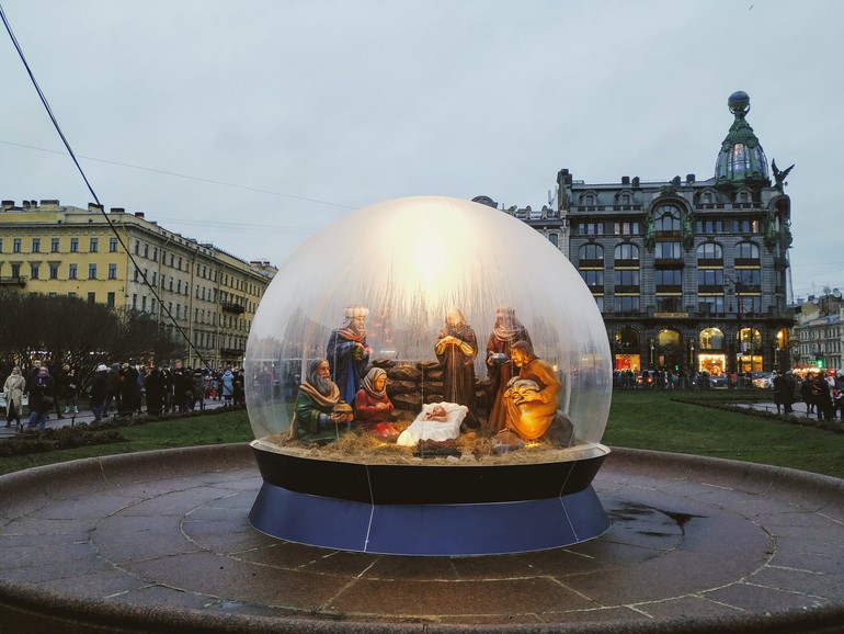 Перед праздником были на Невском. Напротив Казанского собора представлена красивая инсталляция с вертепом.