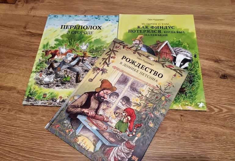 Т.к. я решила не дарить на Новый год книг, то новую часть про Петсона и Финдуса просто предложила прочитать. Прочитали. А потом и остальные две в хозяйстве имеющиеся тут же были прочитаны)