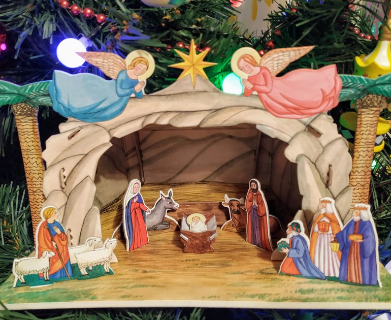 А дома сделали вертеп из комплекта "Умной бумаги". С ним проще было рассказать историю Рождества ребёнку. Пусть и вкратце)