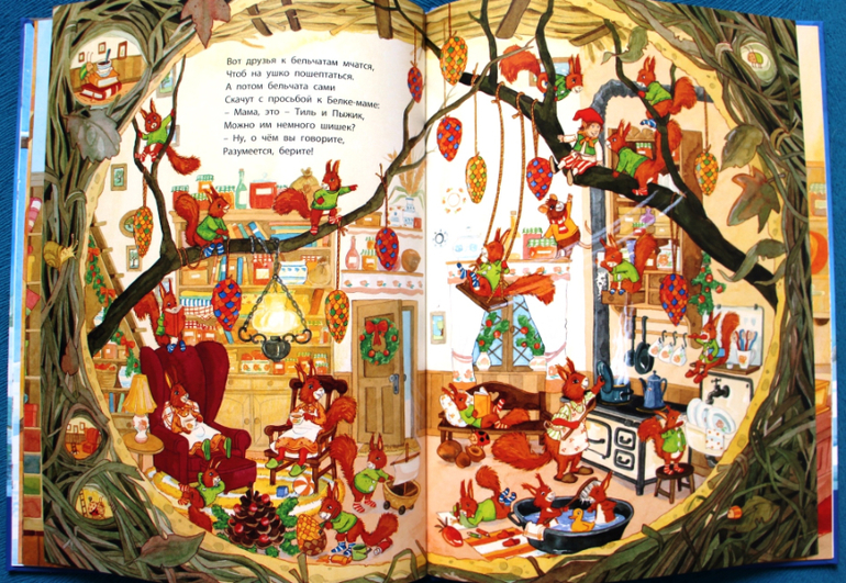 Вся история в книге в стихах - легких для детского слуха. И самое главное в книге, пожалуй, это иллюстрации: каждый разворот это целая жизнь лесного народа, прорисованная очень детально. Получился виммельбух со стихами. На страницах можно рассмотреть многоквартирный дом. Особенно нам понравилось находить крошечные комнатки разных насекомых, червячок в постельке прямо милаха. )))