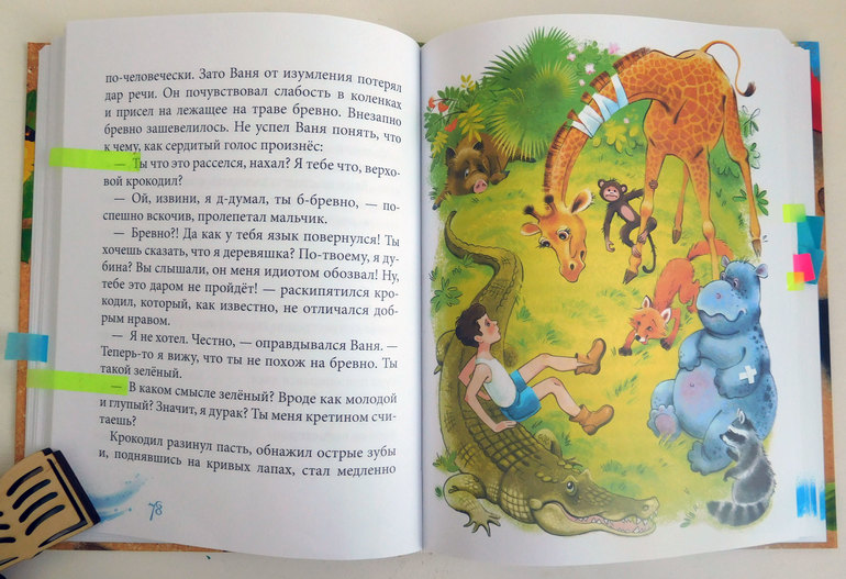 Да и лексикон, используемый автором, не всегда безобидный. В четвертой сказке мы встречаем крокодила, который во время ссоры употребляет слова "дурак", "кретин", "придурок". А еще в книге есть "шизики", "психи" "нахальный заморыш". Таких ругательств немного, они единичные - и, кажется, я уже все их перечислила. Школьники, думаю, ничего нового для себя не откроют - в школах и не такое можно услышать. А вот если бы я читала книгу дошкольнику, то эти слова пришлось бы заменить на что-то более нейтральное.