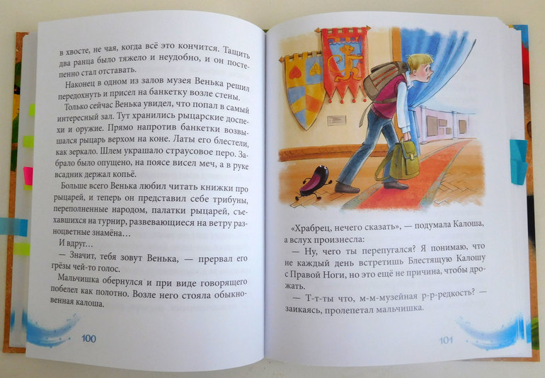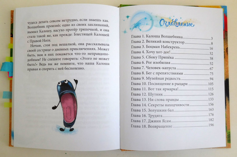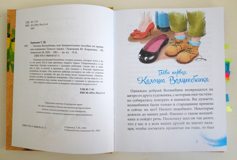 Книга "Калоша Волшебника" ориентирована на детей младшего школьного возраста и старших дошкольников. Однако, на мой взгляд, школьникам эта книга подходит больше - ниже поясню, почему я так думаю. Сказка эта не новая, её уже издавали, но с другими иллюстрациями. Новая книга - это третье издание сказки с новыми рисунками. И на мой взгляд, это издание получилось самым удачным. Иллюстрации для него сделала художник Юлия Корякина. Рисунки разные - есть маленькие, а есть и полностраничные. Их не очень много - примерно один на три разворота. Но я считаю, что количество иллюстраций здесь адекватно возрасту аудитории - всё же эта книга не для малышей.