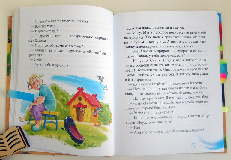 Работа художника в целом мне понравилась. Галоша очаровательна! Но некоторые иллюстрации показались неоднозначными. Когда я только получила книгу, то сразу обратила внимание на рисунок со страницы 36 - я его даже специально отметила закладкой, очень уж неприятная девочка там нарисована. Однако, когда мы стали читать книгу, то оказалось, что рисунок очень подходит к тексту. В этой главе рассказывается о девочке, которая постоянно что-то ест, её мысли заняты едой, и она клянчит еду у родителей. Неприятный, отталкивающий образ! Именно это и нарисовал художник. На мой взгляд, такой рисунок работает на замысел автора - маленький читатель, глядя на девочку, не захочет быть такой, как она.