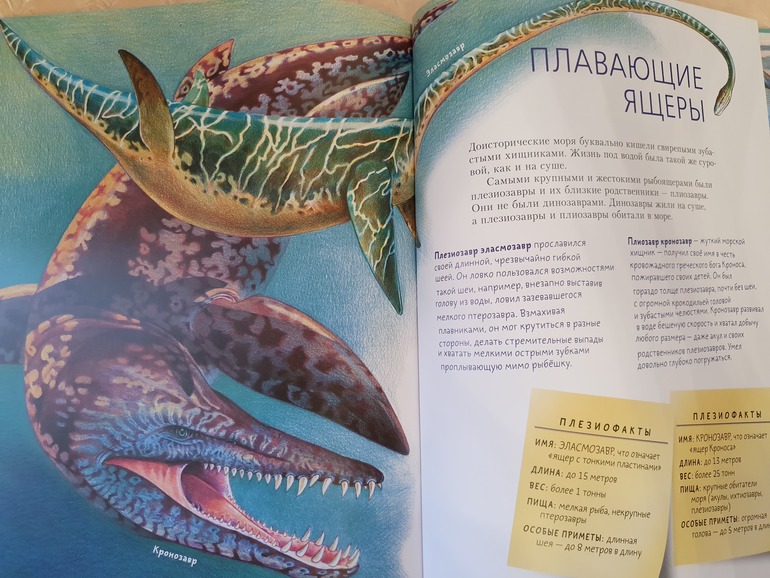 "Динозавры и другие пресмыкающиеся" хорошая книга для начального знакомства с миром динозавров, как дополнение к книгам-энциклопедиям. Информации немного, она скорее обобщающая. Про самих динозавров раздел составляет немного меньше половины издания, остальной объем книги отдан под информацию о пресмыкающихся. Там вообще обо всех понемногу. Я бы предпочла, чтобы это была отдельная книга про динозавров, по мне так получилось "галопом по Европе". Ребенок очень удивился что так быстро закончилось про динозавров)). С другой стороны, мы неплохо усвоили тему пресмыкающихся и вскоре на предшколе, когда в классе проходили эту тему, Ильдар уверенно умничал)).