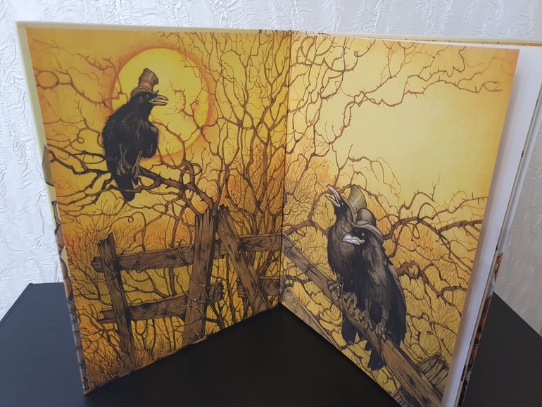Работы художника, повторюсь, потрясающие. Книга нарисована в желто-рыжих осенних оттенках, фото не совсем передает насыщенность красок. Посмотрите какой форзат и вообще каждая мелочь в книге проиллюстрирована на высшем уровне, будь то содержание или просто заглавная буква. Книга в суперобложке, она дублирует изображение на самой обложке.
