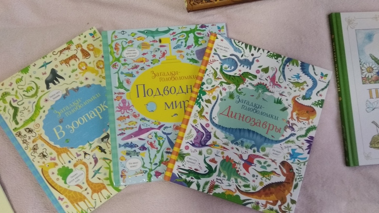 Случайно купила книжку про загадки - залипли вместе с сыном!!! Для нас самое время! Потом побежала и докупила на подарки!! У животных и в море плотные картонные страницы, динозавры честно понравились меньше всего (брала из-за диномании).
