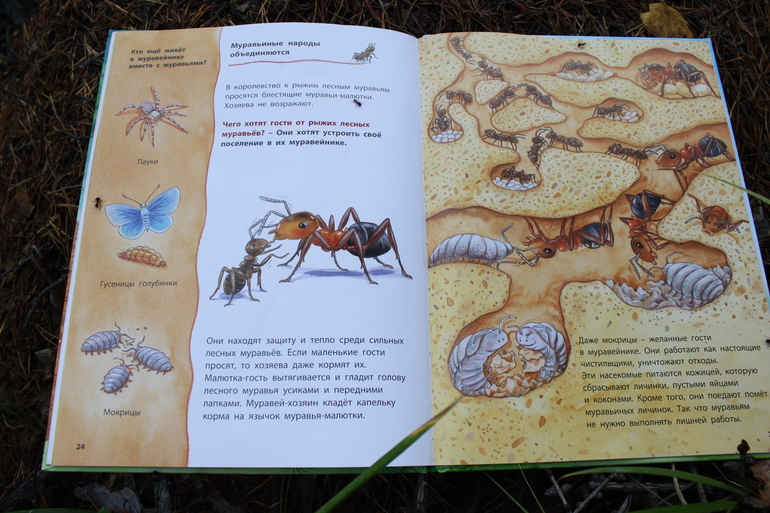 Про пчел и муравьев книги более подробные. Есть про строение "домиков", как эти насекомые растут, размножаются, про их врагов и про симбиоз с другими видами. В книге про пчел есть разворот про пчеловодство.