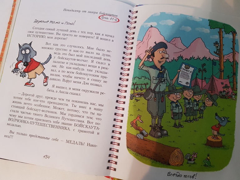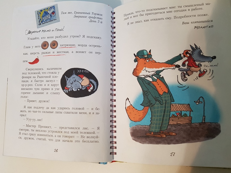 "Книга безобразий Малютки Волка". Ильдару книга понравилась. Написана она в формате дневника-писем от лица маленького волчонка, которого родители отправили на перевоспитание к его дядюшке, чтобы тот из добродушного и мягкотелого малыша сделал хитрого и кровожадного волка). Самая фишка книги конечно в ярких и юмористических иллюстрациях Николая Воронцова. Также в книге есть много заданий по ходу текста, которые дети с удовольствием выполняют. Я давно заметила, что подобный прием Ильдар воспринимает на ура. Книга лучше подойдет на самостоятельное чтение для детей 6-10 лет. Взрослому немного скучновато читать, так как юмор довольно примитивный, на детском уровне, но для них самое то.Книга достаточно объемная кстати.