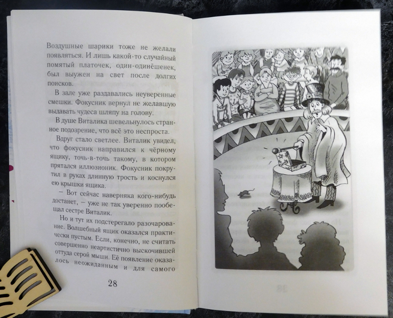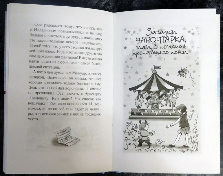 В книгу вошли повести: "Осторожно, фокус! История иллюзионика Оси, рассказанная его другом котом Мемуаром" и "Загадки Чаро-парка, или В поисках пропавшего пони". Я читала эту книгу вместе с мальчишками 9 и 11 лет, и нам она понравилась.