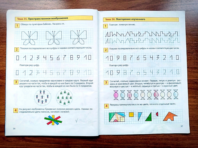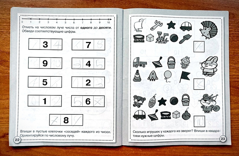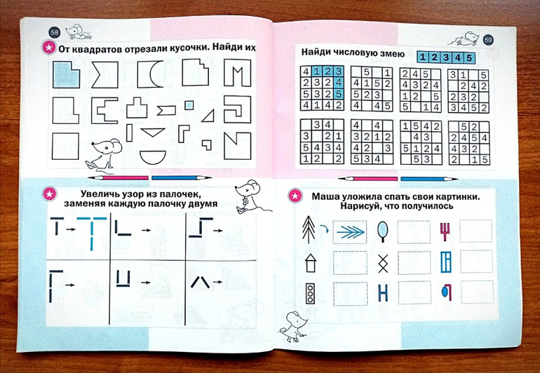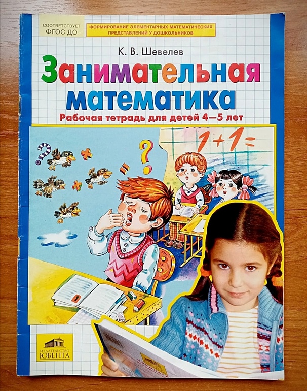 Занимательная математика мне больше понравилась в плане развития пространственного мышления, чем обучения счету. Цифры в пособии даны печатные (как на конвертах). Зато нужно много рисовать по клеточкам, соотносить число с количеством, продолжать логические ряды и многое другое.