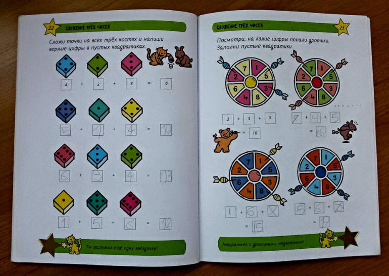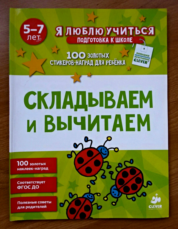 Учебное пособие "Складываем и вычитаем" учит ребенка работать с цифрами в пределах двадцати. Но самое интересное в ней для детей - это золотые звездочки. В начале тетради целых две страницы заполнены поощрительными наклейками. И на каждом развороте есть специальное место, куда их надо приклеить, после выполнения заданий. Мы выполнили все задания, приклеили все наклейки и полтора листа у нас еще осталось. Оставшиеся звездочки быстро перекочевали в другие пособия и тетради. А благодаря этому пособию мы попрактиковались в счете и даже познакомились с мелкими деньгами.
