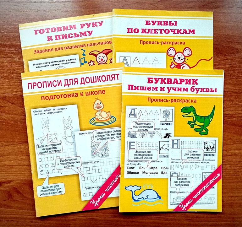 Еще одна хорошая серия прописей для дошкольников от простых элементов и конструирования по клеточкам до написания печатных букв. Называется серия "Уроки чистописания", пособия в ней небольшие по 16 страниц. Начинали мы с тетрадей "Готовим руку к письму" и "Прописи для дошколят". Они содержат четыре вида заданий: