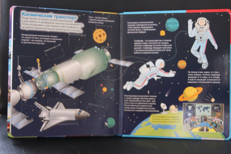 А последний разворот про космос))) Книга выполнена качественно, твёрдые картонные страницы, яркие иллюстрации, прочные окошки. Мне книга понравилась, для детей дошкольного возраста интересно. Чётко и понятно рассказывается о устройстве автомобиля. Для каких целей и ситуаций используется тот или иной транспорт. Сын может бесконечно рассматривать книгу и открывать и закрывать окошки.