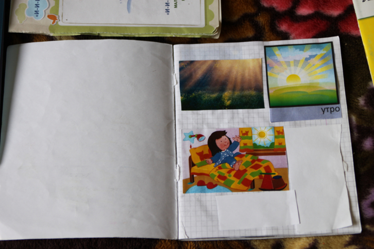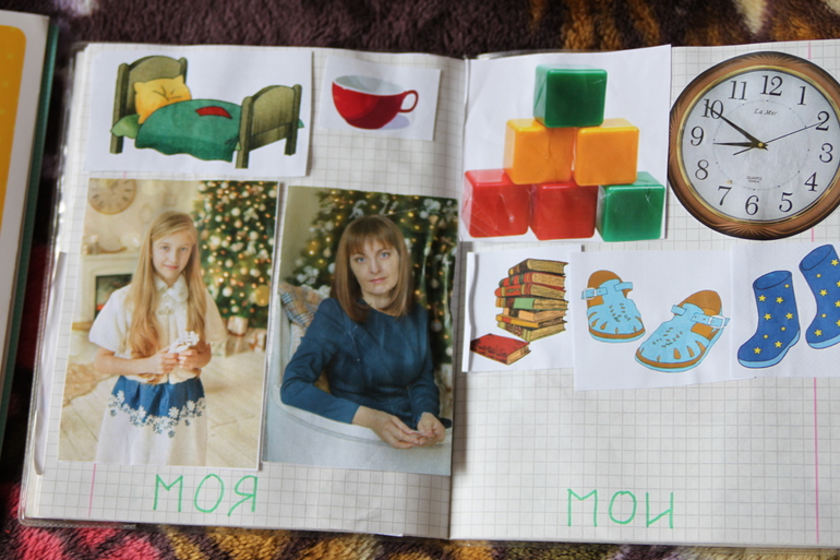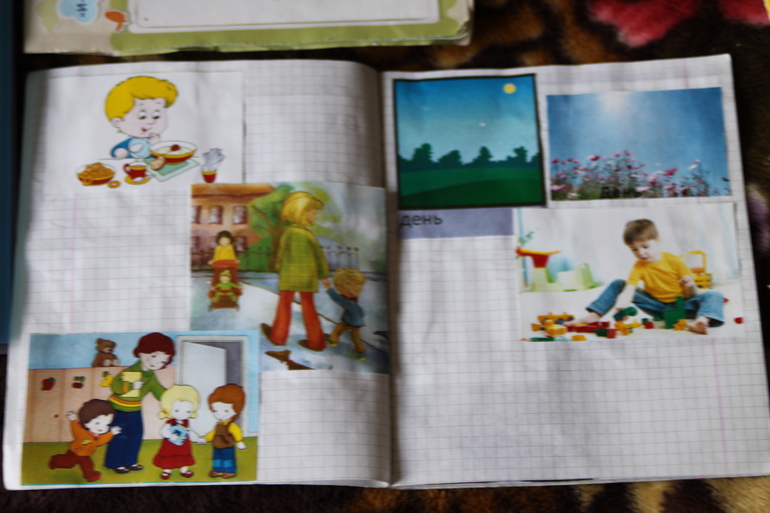 Здесь я вырезала и вклеивала все в чем мой сын испытывал трудности, и временные понятия, и изменения по лицам, с картинками предметов, которые он встречал в повседневной жизни.