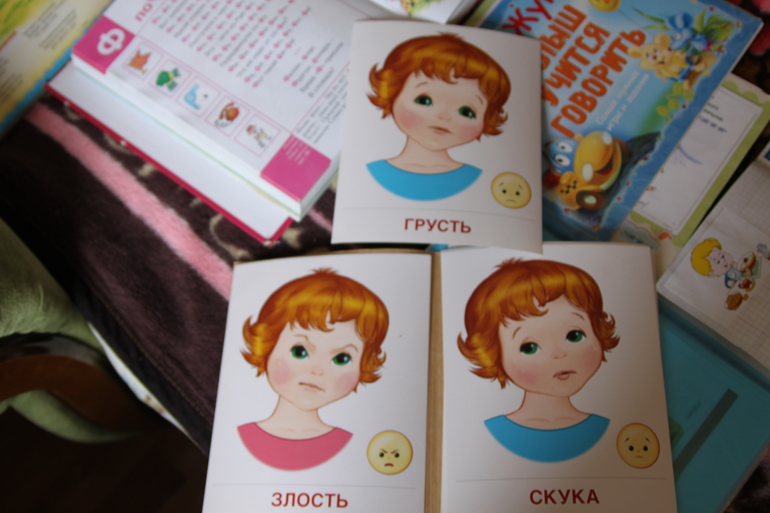 У детей с задержкой речевого развития всегда скудны эмоции. Для этого я купила карточки с эмоциями. Мы смотрели карточки, корчили рожицы, изображали удивление и огорчение. Хорошо развивается мимика.