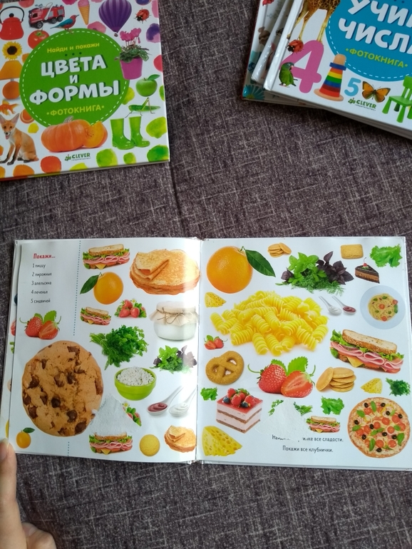 А вот книги-гляделки - это определенно успех. С ними дочь могла сидеть долго и рассматривать картинки. Самое удачное вложение денег получилось :) Сначала у нас была серия Найди и покажи от Clever. Очень удачные фотокниги, жаль их уже не продают, а то бы и транспорт докупила. Самой популярной у Маюхи была книга про еду.