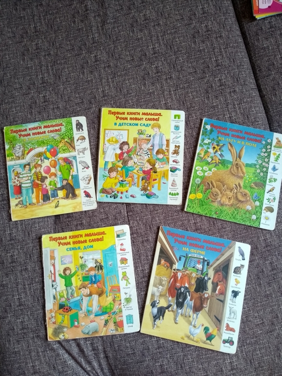 Потом была серия книг Улыбка.Учим новые слова. Самыми ходовыми стали книги про детсад и про семью (не счесть сколько раз я их заклеивала). Маюхе нравилось искать предметы на большой картинке. А вот книга про животных "На лугу и в поле" была проигнорирована (подозреваю,что из-за отсутствия детей).