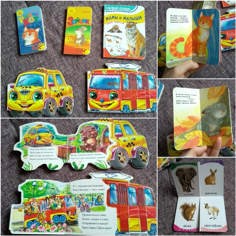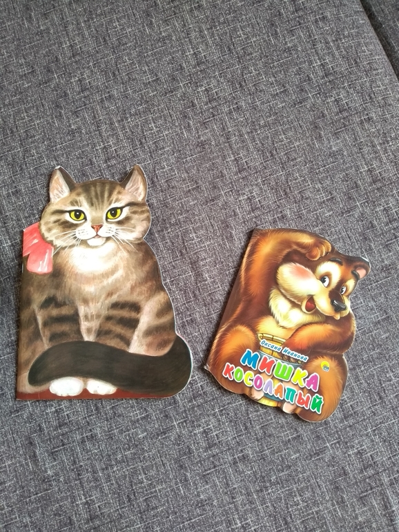 Книжки-игрушки. Известный Котик-коток и Мишка косолапый из Фикс-прайса. Дочь благосклонно слушала, рассматривая котов. До сих пор если увидит, просит почитать. Мишка косолапый такой популярности не имел.