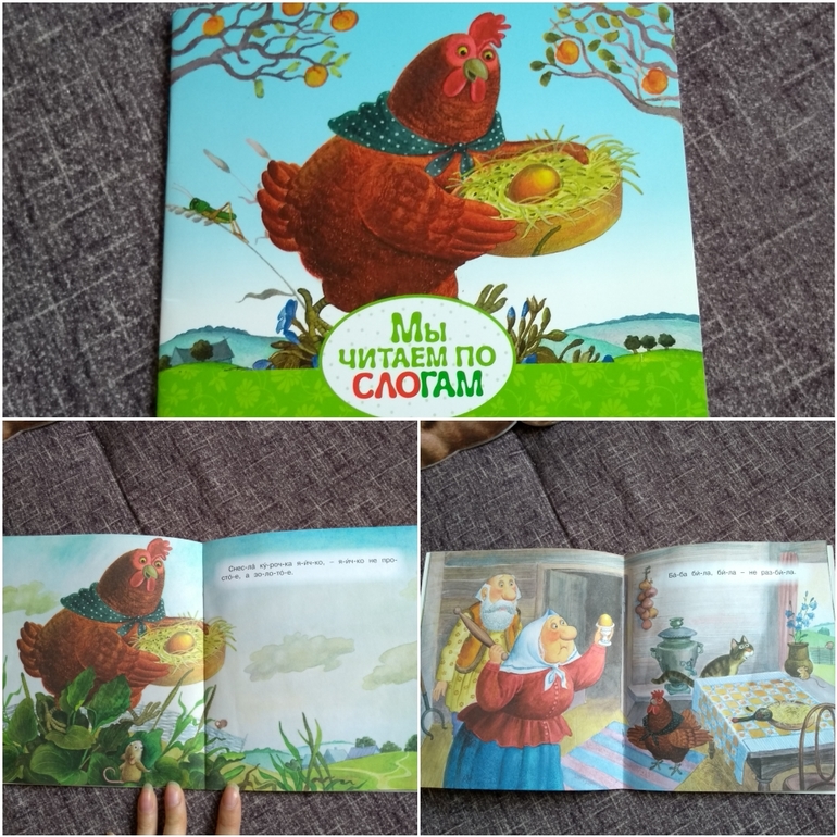 Курочка Ряба из серии Мы читаем по слогам очень хорошо зашла - все потому, что она идеальна для таких малышей. На каждой странице одна картинка и одно предложение, все просто и понятно, ожидаемо пользовалась популярностью.