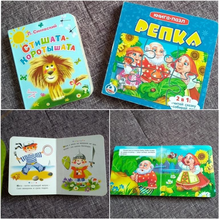 Толстенькие картонные книги. Дочь любила репку опять же за то, что на одну картинку - одно предложение, все четко и понятно (кроме одного разворота). Плюс пазлы собирать после прочтения хорошее занятие (после 1,5 лет). Стишата-коротышата успех не имели, сейчас иногда приносит почитать.