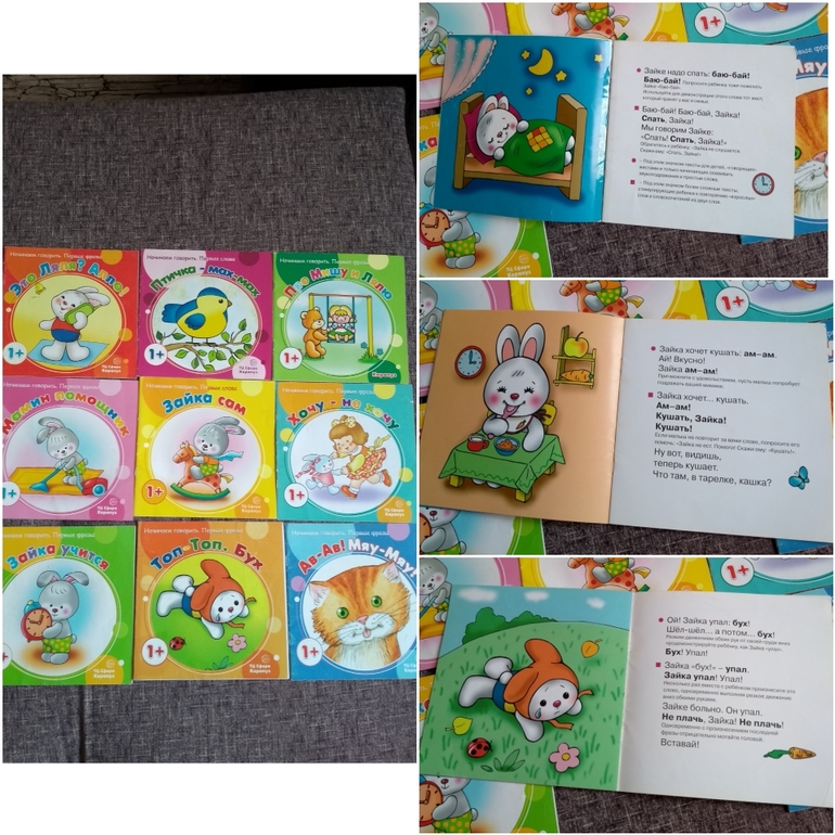 Ну и главный хит этого периода - книги про зайку. Это была просто бомба. Мы читали и перечитывали их за один присест по три раза, разглядывали картинки, повторяли движения а вскоре и научились говорить) Я до сих пор считаю, что эта серия была одним из помощников в процессе "разговорения" Маюни. Почти все ситуации понятны ребенку, ему нравится включаться в чтение и повторять - что еще нужно для счастья маме?) Фаворитом была книга "Топ-топ. Бух".