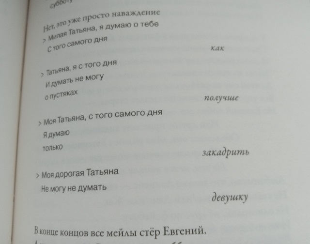 Ох, как много я уже написала! Но ведь написать хотела еще больше! Про цитаты и параллели с Пушкиным, про крылатые фразы, которые хочется куда-то записать ("Как нежно ранят эсэмэски", "о недомерки чувств!"(как думаете, о чём это? О смайликах! И ведь не скажешь точнее), "мы всегда чувствуем себя слишком юными для ответственности", "а ты из-за зубных пластин не разглядел души, кретин"...), о языке (ведь все стихи и нестихи здесь удивительно точно характеризуют героев: хорошо зарифмованные, с правильным размером выступления профессора - научного руководителя Татьяны; неумелые, но честные и романтичные вирши Ленского; изломанные и корявые, то стихи - то проза Евгения и Татьяны...). Еще постоянно ловила себя на мысли, что если "Евгений Онегин" - энциклопедия жизни 19 века, то здесь тоже понапихано столько всего, что может служить энциклопедией современной жизни. Не говоря уж о мейлах, мобильниках, скайпе и т.п., есть отсылки к мировым музеям, писателям, художникам и другим знаменитостям ("Татьяна представила эту кузину: / Бёдра - как у Джоли Анджелины")), даже к производителям одежды и обуви (Ленский "в зеленой майке H&M, черных джинсах, кедах Bensimon").