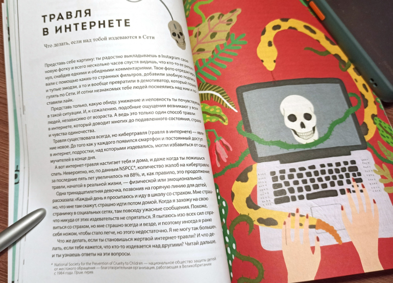 - часто встречается совет обратиться за помощью к школьному психологу или учителю: в нашей стране это сомнительно. Напротив, мне кажется, если ребенок получает такие книги, то родители у него нормальные и лучше обратиться к ним. Книга замечательная, просто учтите, этот момент стоит обсудить с читателем.