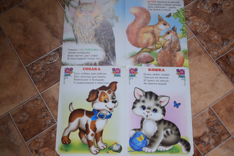 "Домашние животные" О. Громова. Крупные картинки.пара строчек про то, как животное говорит, но нам нравится.