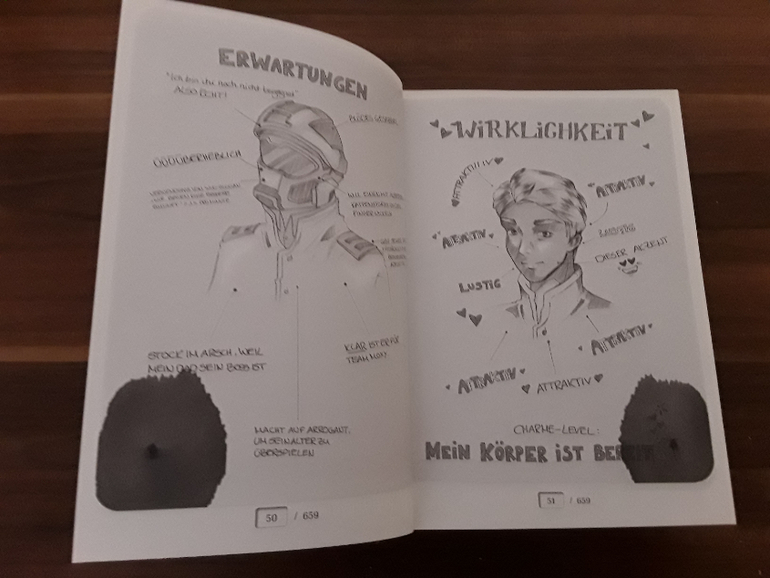 Ну, например, вы наверное заметили на фотографиях кровь на страницах дневника, дневник этот принадлежит Ханне, она записывает и зарисовывает туда свои впечатления и мысли. Так вот эти пятна появляются практически с первых страниц, увеличиваясь и насыщаясь по мере развития сюжета.