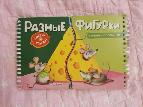 А это картонка от Азбукварика про геометрические фигуры, тоже отличная серия. На каждом развороте - крупно нарисована фигура, стишок с упоминанием фигуры и примеры из жизни. Половинки нужно сопоставить.