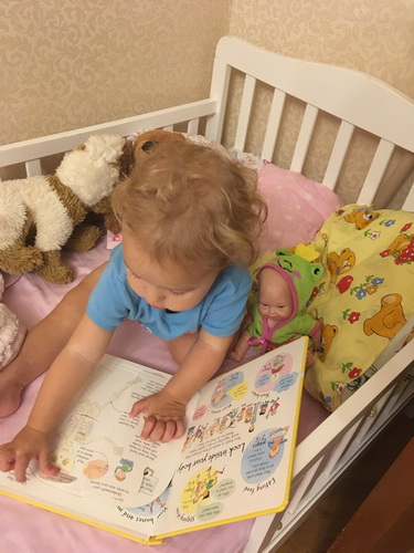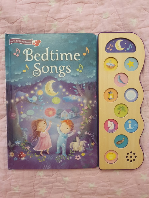 Вот их у нас таскается много, некоторые от старшей. Но София к большинству книг равнодушна. Неравнодушна она к этой американской книге с колыбельными - текст песен написан на страницах, а при нажатии кнопки играет только мелодия.
