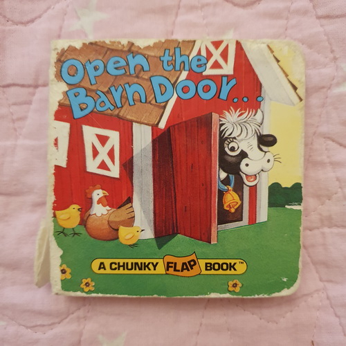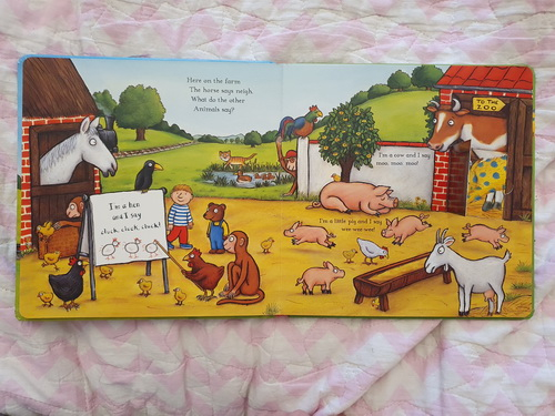 Это классика жанра, так сказать. Книга небольшого формата, удобно брать с собой. Внутри по одному клапану на развороте, за каждым прячется животное фермы. Затасканная, потому что от старшей еще=)