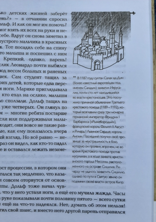 Современный юноша из Голландии, 15- летний Дольф очень мечтал оказаться на рыцарском турнире, который проходил во Франции в 1212 году! Нереальное желание, но на его счастье, или на испытание, у отца Дольфа оказались друзья- изобретатели машины времени. Но только вместо зрелищного турнира во Франции Дольф оказывается в Германии, где становится активным участником детского крестового похода! Умный, сострадательный, ответственный подросток из нашего времени берет на себя миссию хоть как то облегчить и улучшить путь детей ради великой цели.. Это трудно, это сложно, это требует невероятных и физических, и моральных сил, а иногда это нереально больно.. да и с великой целью все оказывается не так просто.. но Дольф достойно справится! Отличный приключенческий исторический роман! Интригует, трогает, просвещает! Очень интересно следить за взаимоотношениями детьми, за тем, как они устраивают свой быт, учатся заботиться друг о друге, учатся выживать! Очень понравилось, что на протяжении всего романа по тексту встречаются сноски, объясняющие все непонятные термины и понятия, отличное погружение в эпоху! Могу сказать точно, теперь про Средневековье и Крестовые походы я знаю много больше.