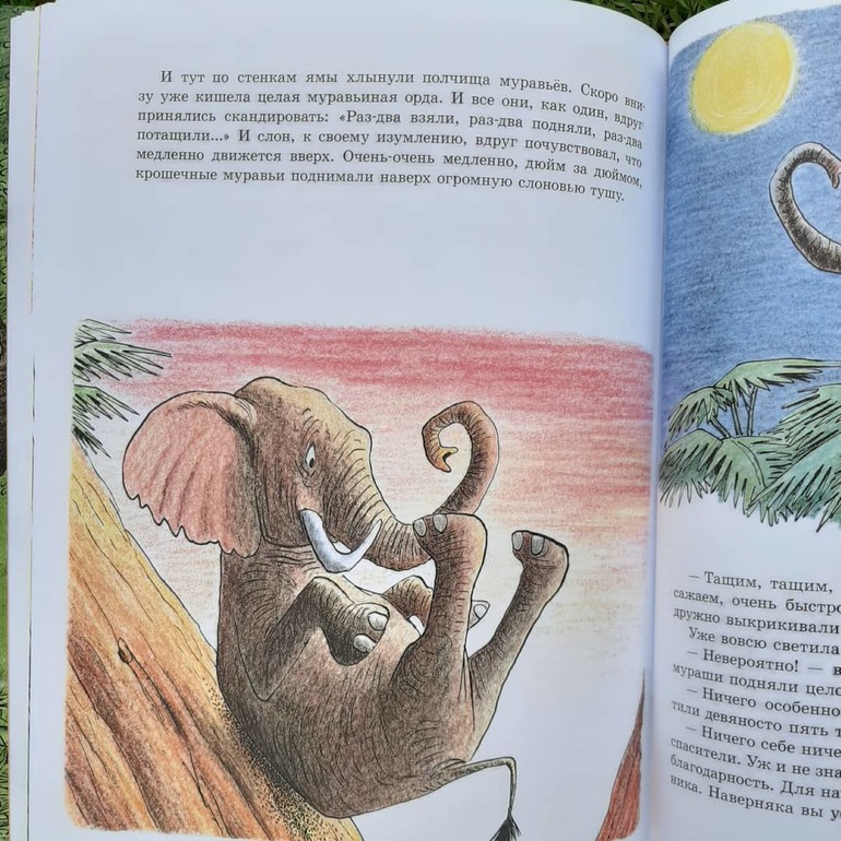 А добрый большой слон, помог всем, вызывает только уважение, но слишком возгордился и попал впросак, а точнее в яму🙈 и не смотря на размер, именно маленькие муравьи помогли ему выйти из сложной ситуации)