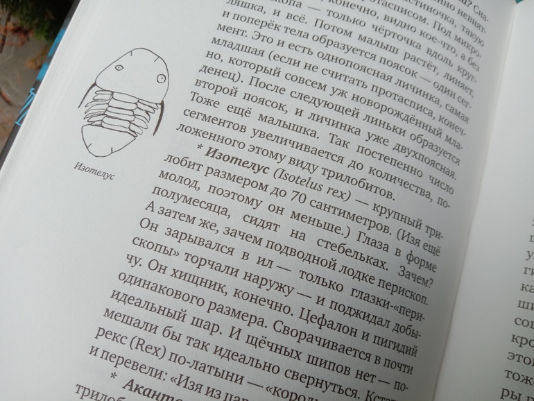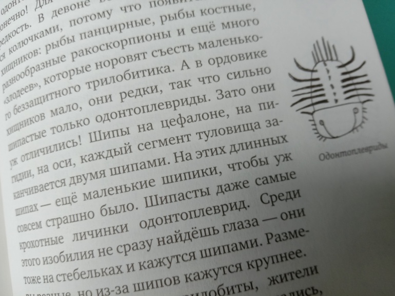 Но ценность книги те только в этой направленности и не только в приключениях героев. Она написана с потрясающим юмором и насквозь пропитана информацией о жизни и существах, населявших Землю в период, предшествующий великому ордовикскому вымиранию. Причём и эта, вроде бы, скучная научная информация, подана просто, доступно и всё с тем же юмором. Вот, например, описание арандаспид: "Поскольку до возникновения настоящих рыб оставались ещё миллионы лет, эти существа считались рыбами ордовикского периода. А что - чем не рыба? Форма удлиненная, рыбья, есть хвостовой плавник, есть хорда - нечто вроде будущего позвоночника, есть боковая линия, как у рыб. Вот до чешуи они ещё не додумались, и на коже были прикреплены костные пластиночки и бляшки. Короче говоря, это был новодел эволюции, ещё не до конца проработанный. Плавали эти недоразумения плохо: без плавников-стабилизаторов да без плавательного пузыря конструкция заваливалась. Висели над дном и что-то там фильтровали из воды и ила своим маленьким ротиком на нижней поверхности тела". А вот трилобиты рассуждают, как можно приспособиться к жизни на суше: "Если жить на Суше, то надо как-то разделить те ноги, которыми мы ходим, и те, которыми мы дышим. Дыхательные ноги задрать наверх, что ли. А то грязь в жабры набивается и дышать мешает".