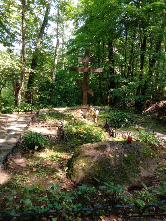 Дошли до могилы. Простой заросший мхом камень и большой крест над обрывом. Таково было завещание писателя. Надо сказать, в 1968 году было большой смелостью возвести над могилой известного писателя крест...