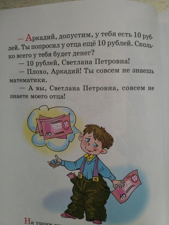 Школьные анегдоты купила для развлечения, прочел около трети, не все ему понятно, некоторые приходилось объяснять, вот наш любимый анегдот))