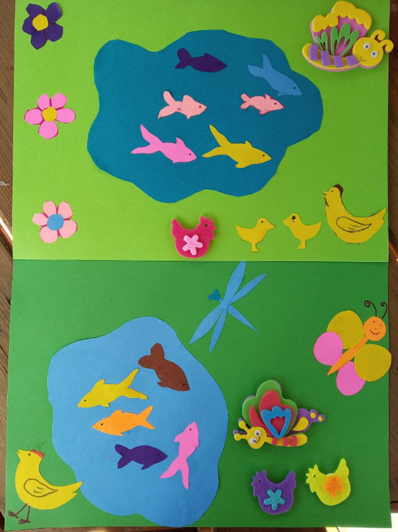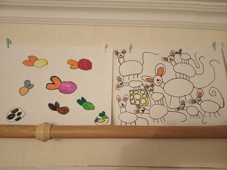 Начали с аппликации, потому что Лева просил клеить)) Сверху Лизина, снизу Левина