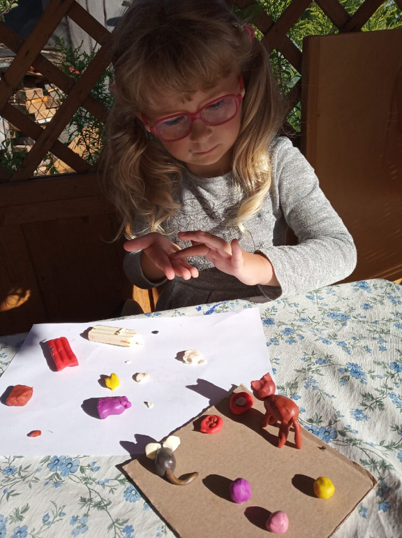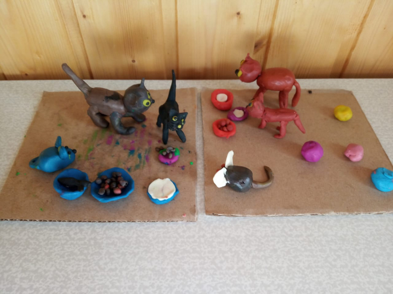 Левина слева, Лизина справа. Лева помогал прилеплять лапы и хвосты, складывал корм в тарелочки, прилеплял молочко. Лиза старалась делать сама, но периодически приходилось подправлять что-нибудь.
