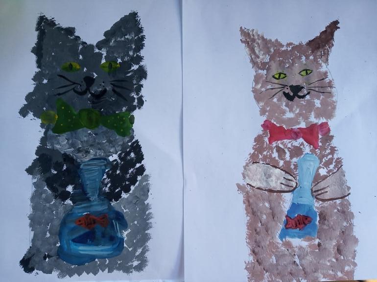 Рисовали по видеоуроку. Лизина коричневая, наша с Левой серая. Лева весьма неплохо тыкал шерстку, раскрашивал мешочек с рыбкой. У Лизиной кошки я обвела глазки и лапки, сделала узор на рыбке
