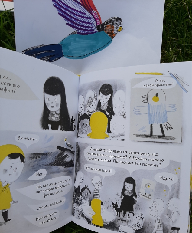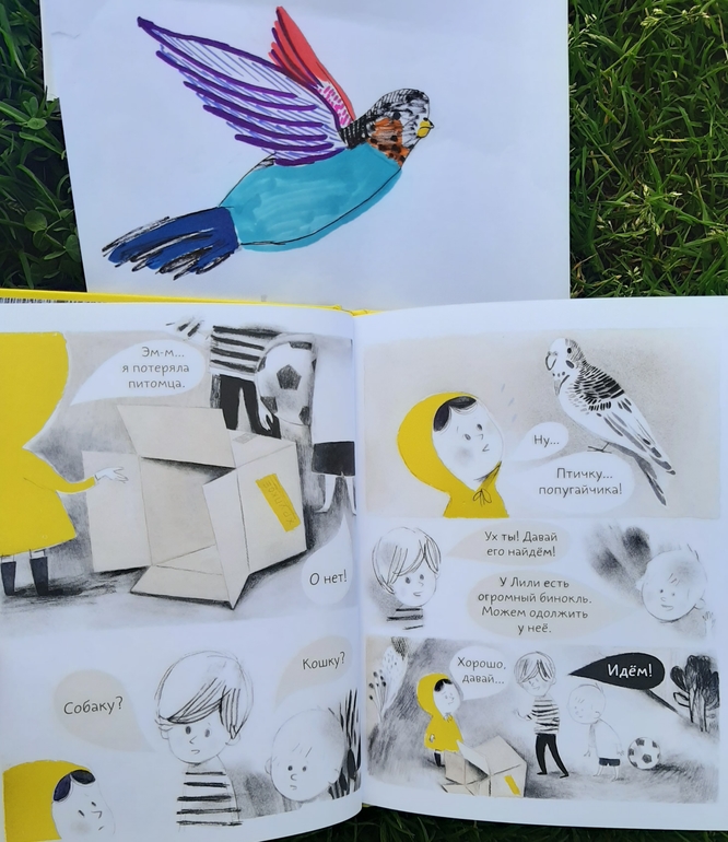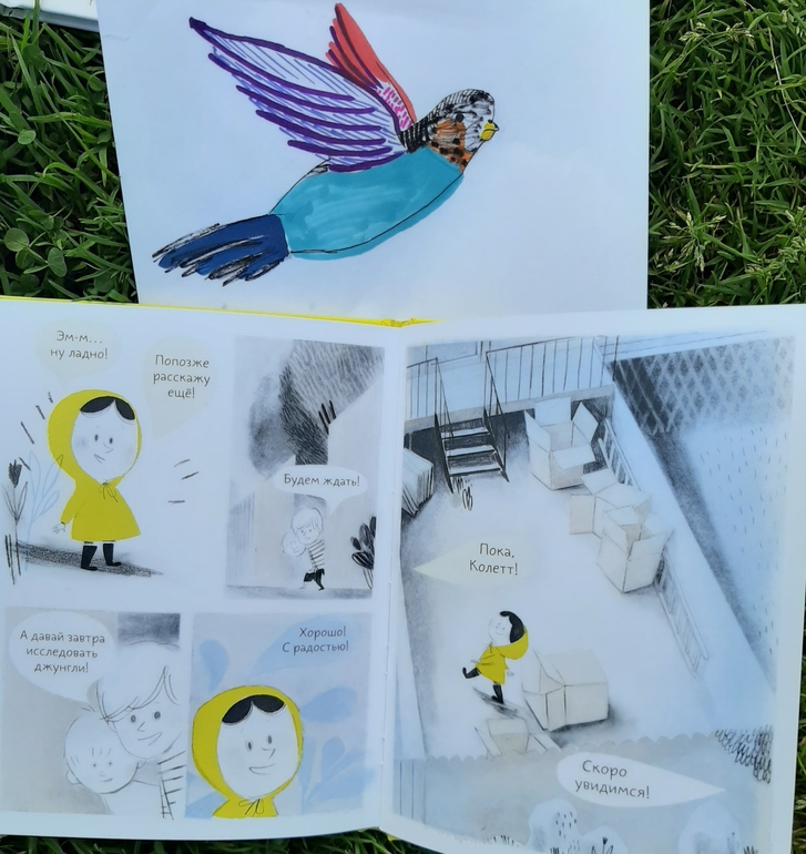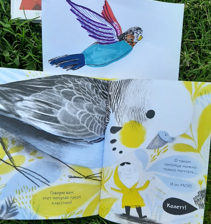 И Колетт не просто придумала себе милого попугайчика, но и впечатлила новых друзей историей и вдохновила всех на поиски своего воображаемого питомца! Как порой тонка грань между детским враньем и детской фантазией! Но как важны фантазия, воображение и придуманные миры в детском возрасте!