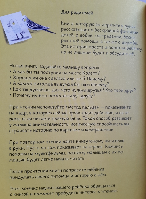 Книга Попугай Колетт отлично подойдет для первого чтения, удобный шрифт и текст по нарастающей, и главная интрига, чем же кончится, будет подстегивать юных читателей. Но вполне эту книгу можно использовать и для совместных чтений. В начале книги есть рекомендации, как лучше и продуктивнее читать эту книгу, чтоб она стала не просто книгой, но и поводом поговорить с ребенком!