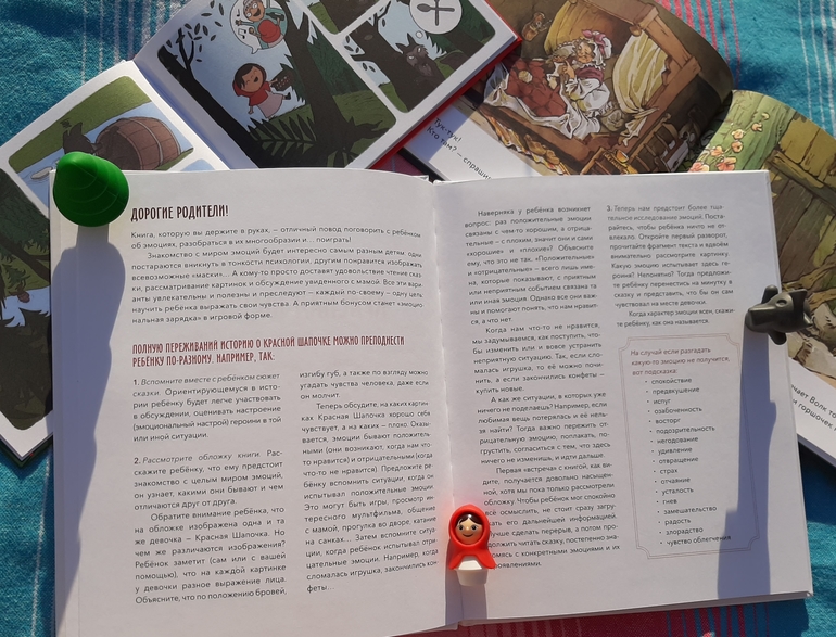 У нас есть карточки с эмоциями, и как не сильно мы ими пользовались, просто показывать и называть оказалось скучно сыну.. а тут на примере сказочного персонажа процесс заиграл новыми красками) интересно определить и назвать ту эмоцию, которую испытывает девочка, вспомнить, когда ты сам испытывал такую эмоцию, и, конечно нужно попытаться ее изобразить) в начале книге есть вводная статья нейропсихолога Т. Ланговой, с подсказками и рекомендациями, как лучше работать с книгой и о чем поговорить после.