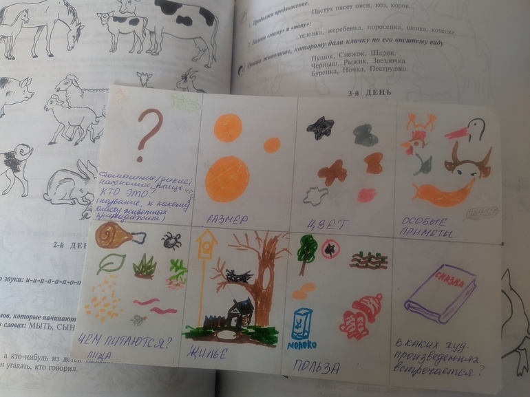Слоги можно пропевать и хлопать в ладоши (загибать пальчики, ставить кубики) на каждый слог, например. Для рассказов обычно используем схему: кто изображен, что делает и т. д. Удобно рисовать "план" для описания животного или растения, например: