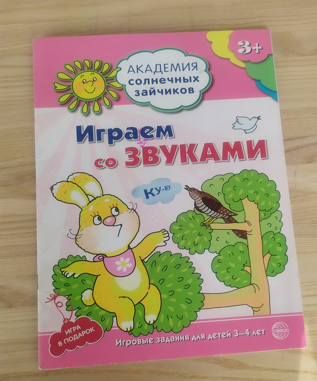 "Играем со звуками" от "Сфера" (Серия "Академия солнечных зайчиков") формат А4, листы не просвечивают. В середине книги были разрезные карточки для игр со звуками. В самой книге разнообразные задания, крупные рисунки. Сын после таких игр хорошо сейчас выделяет звуки твердые и мягкие, слоги вначале слов.