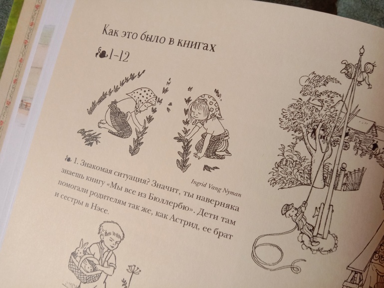 То есть в тексте рассказывается о каком-то случае из жизни маленькой Астрид, а в комментариях - как этот эпизод отразился в той или иной её книге. Плюс почти к каждому комментарию есть иллюстрация из книги, причём иллюстрации принадлежат основным художникам, сотрудничавшим с писательницей: Ингрид Ванг Нюман (Пеппи, Бюллербю), Бьёрн Берг (Эмиль), Илон Викланд (Мадикен, Мио, Карлсон и др.) Фамилии художников везде подписаны, но очень мелко и по-английски.